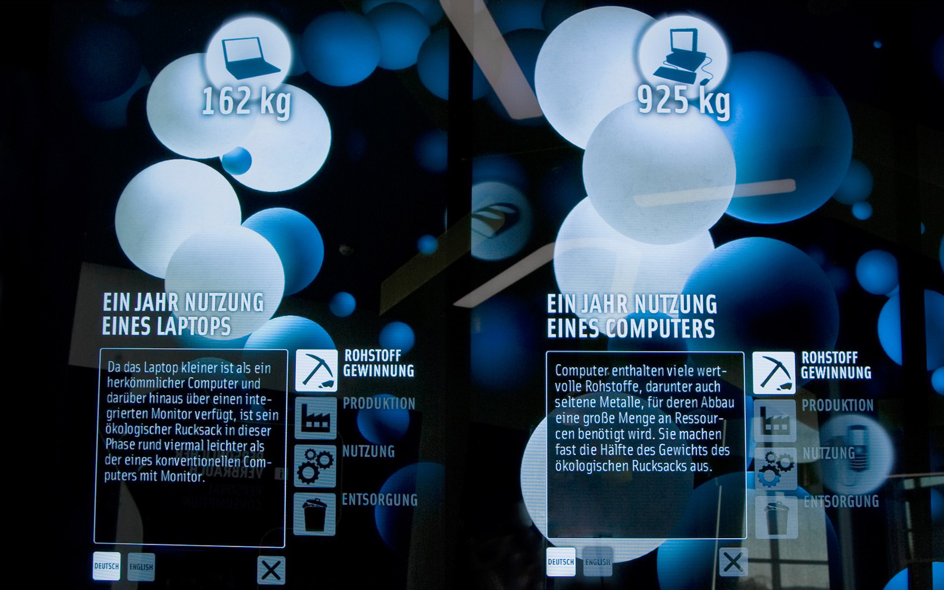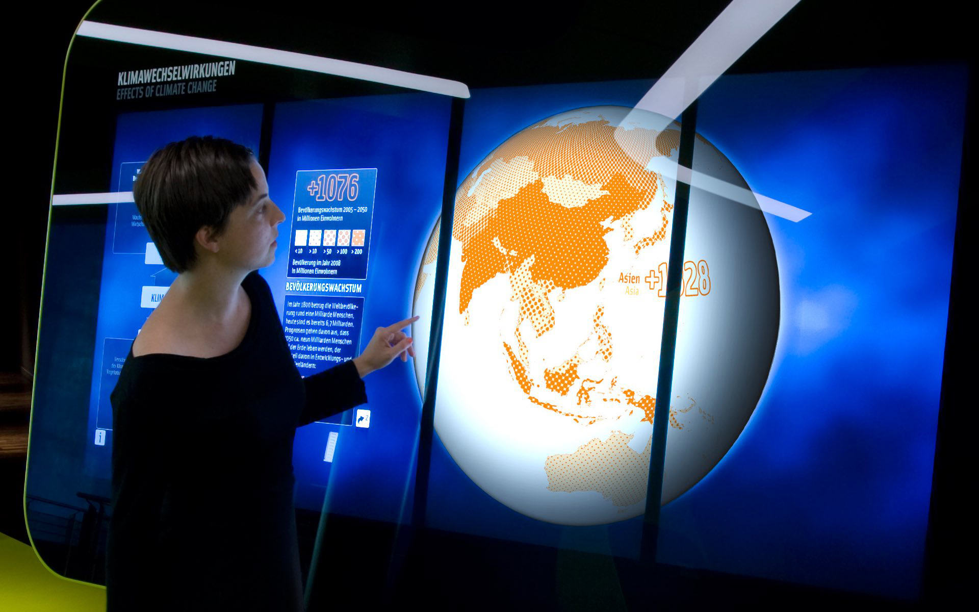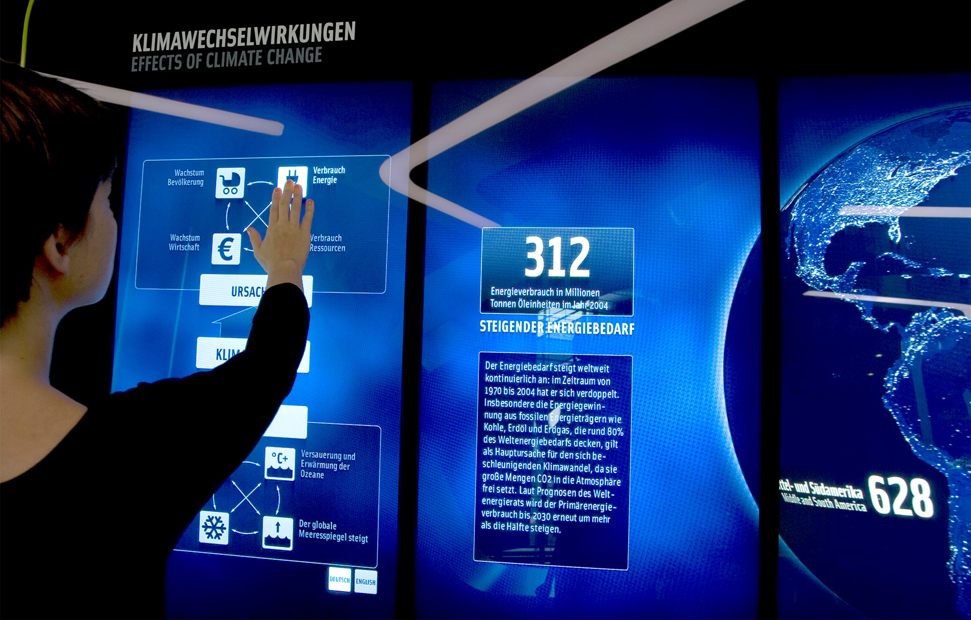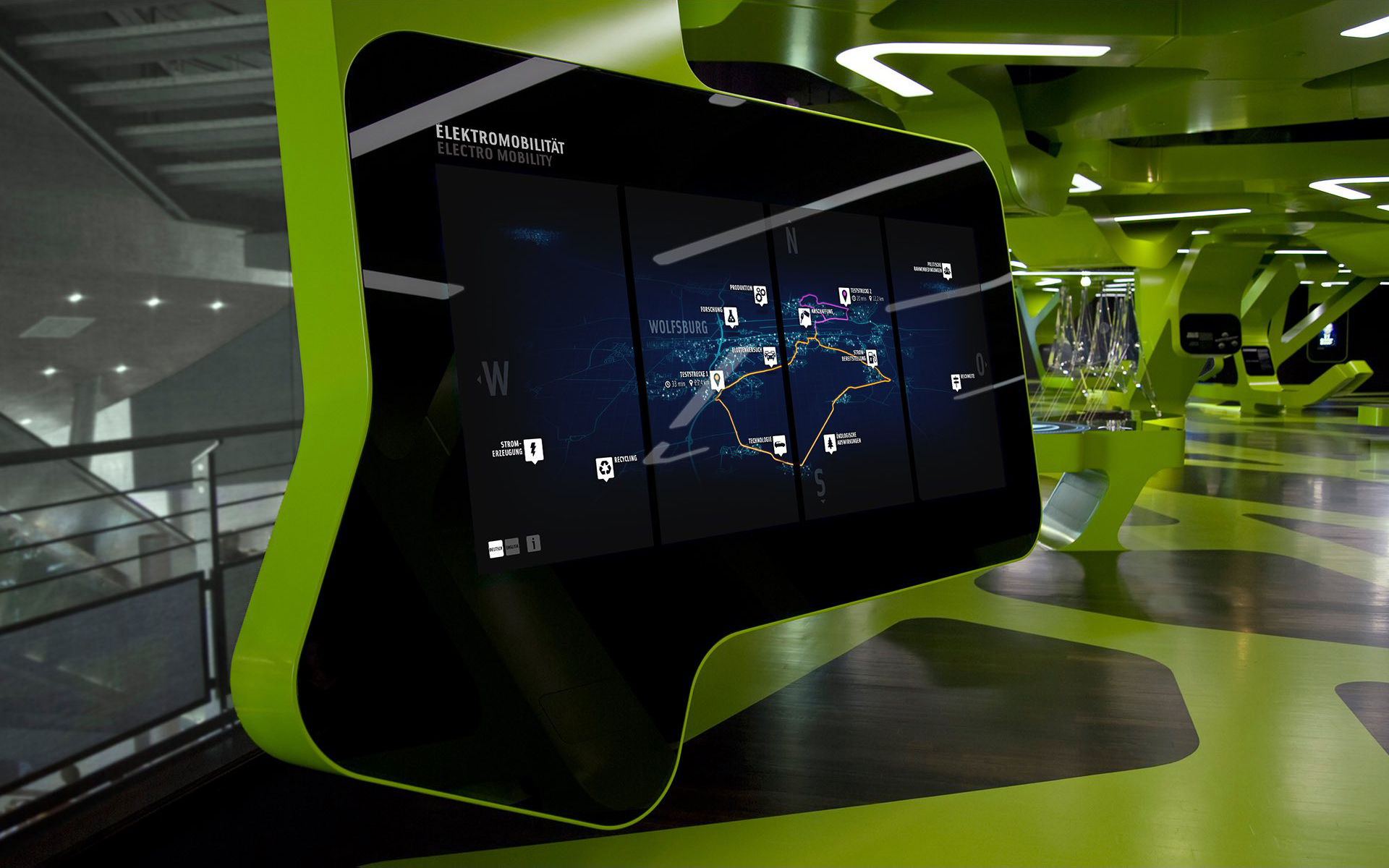 »Level Green« at the Volkswagen Autostadt in Wolfsburg, is a permanent – continuously updated – exhibition about different aspects of sustainability. More than 25 different media exhibits – in the form of data sculptures, analogue visualizations, interactive screens and projections – are allowing each visitor to learn about the complex issues surrounding sustainability. Through playful interaction with the different media formats, visitors are invited to reflect their own lifestyle and habits and therefore create a more personal connection to the issue and receiving better answers to their questions on sustainability.