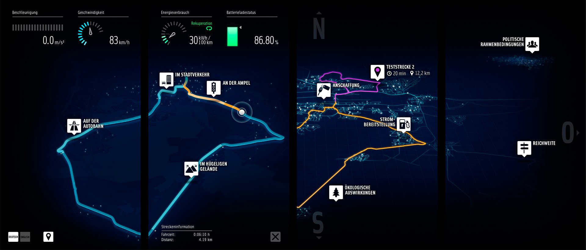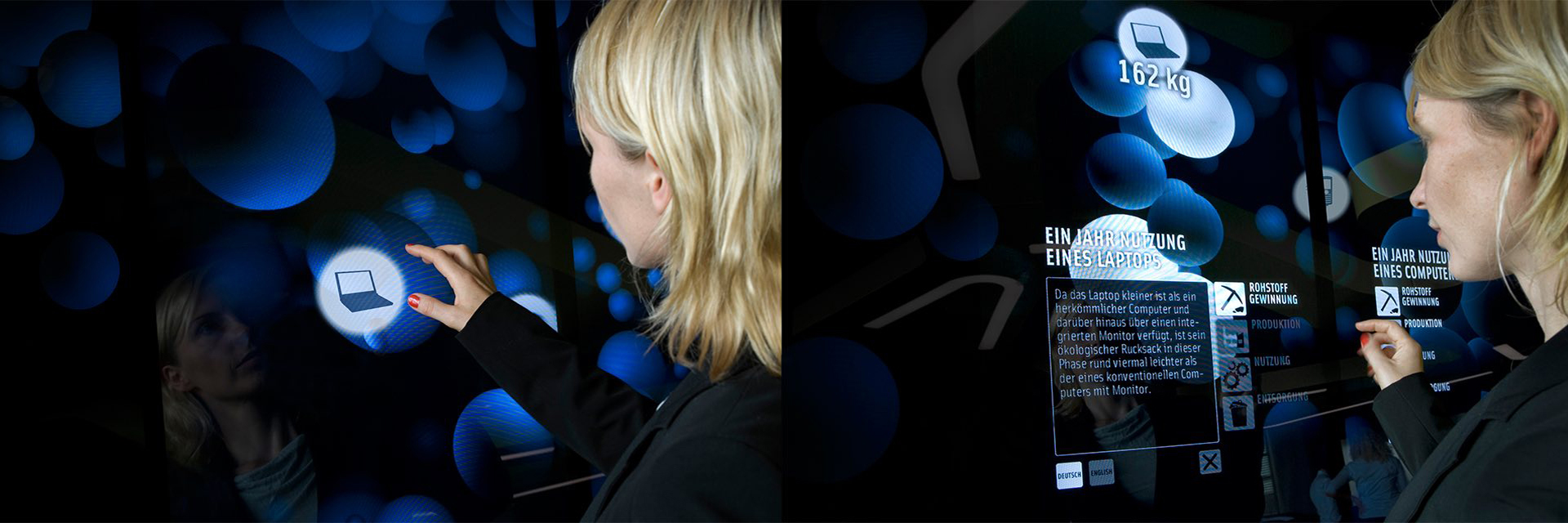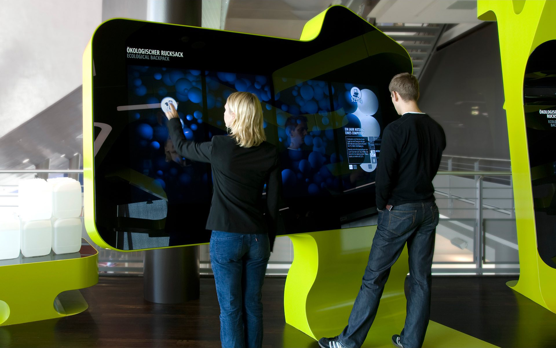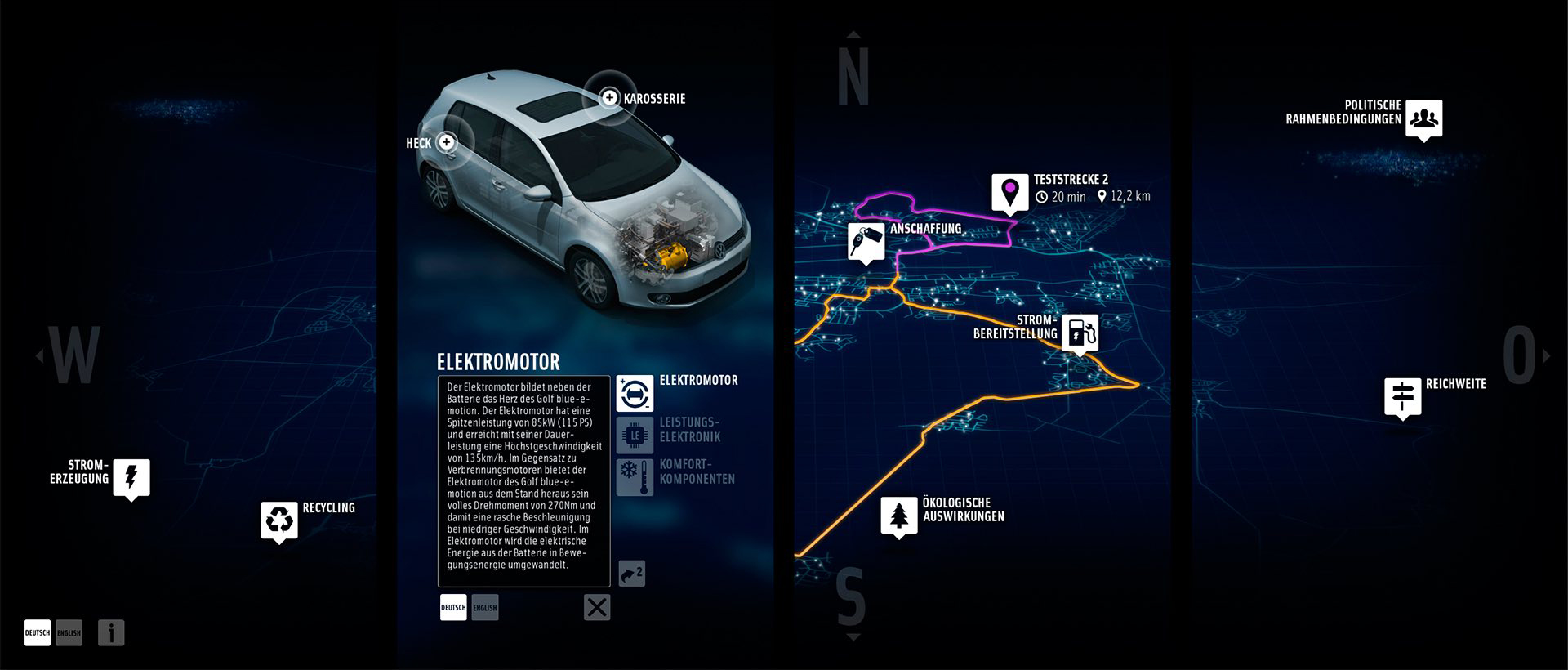 »Level Green« at the Volkswagen Autostadt in Wolfsburg, is a permanent – continuously updated – exhibition about different aspects of sustainability. More than 25 different media exhibits – in the form of data sculptures, analogue visualizations, interactive screens and projections – are allowing each visitor to learn about the complex issues surrounding sustainability. Through playful interaction with the different media formats, visitors are invited to reflect their own lifestyle and habits and therefore create a more personal connection to the issue and receiving better answers to their questions on sustainability.