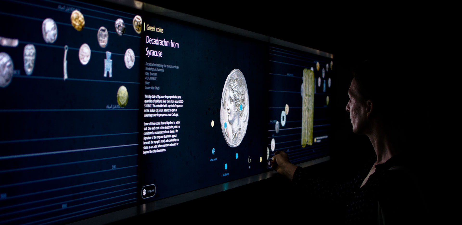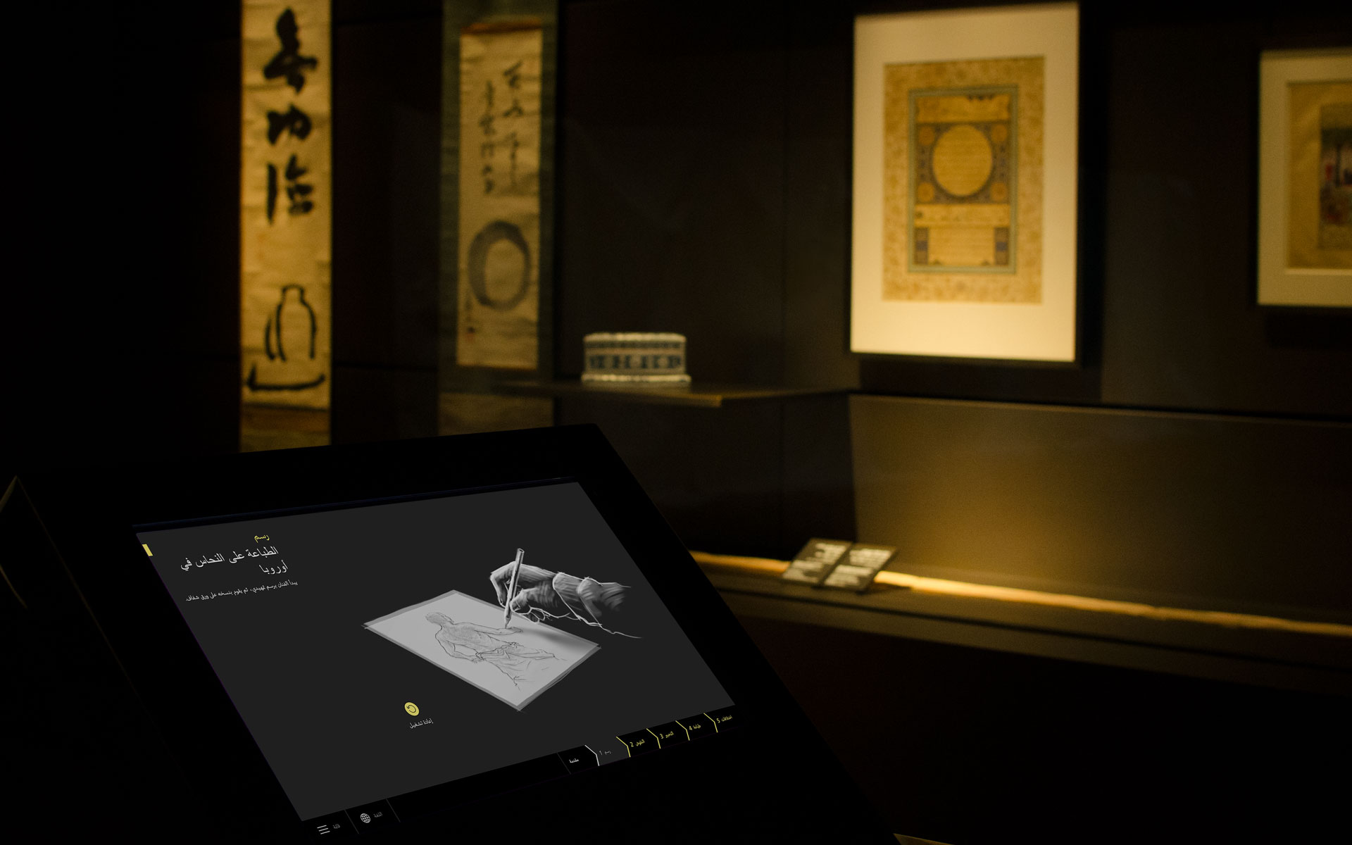 For the permanent exhibition of the Louvre Abu Dhabi we created a series of interactive media stations, media walls and three media tables. The interactive stations are in close proximity to the exhibits. They offer a playful access to in-depth information and allowing the visitors to receive additional knowledge like method of manufacture, motifs and materials of the specific exhibits.