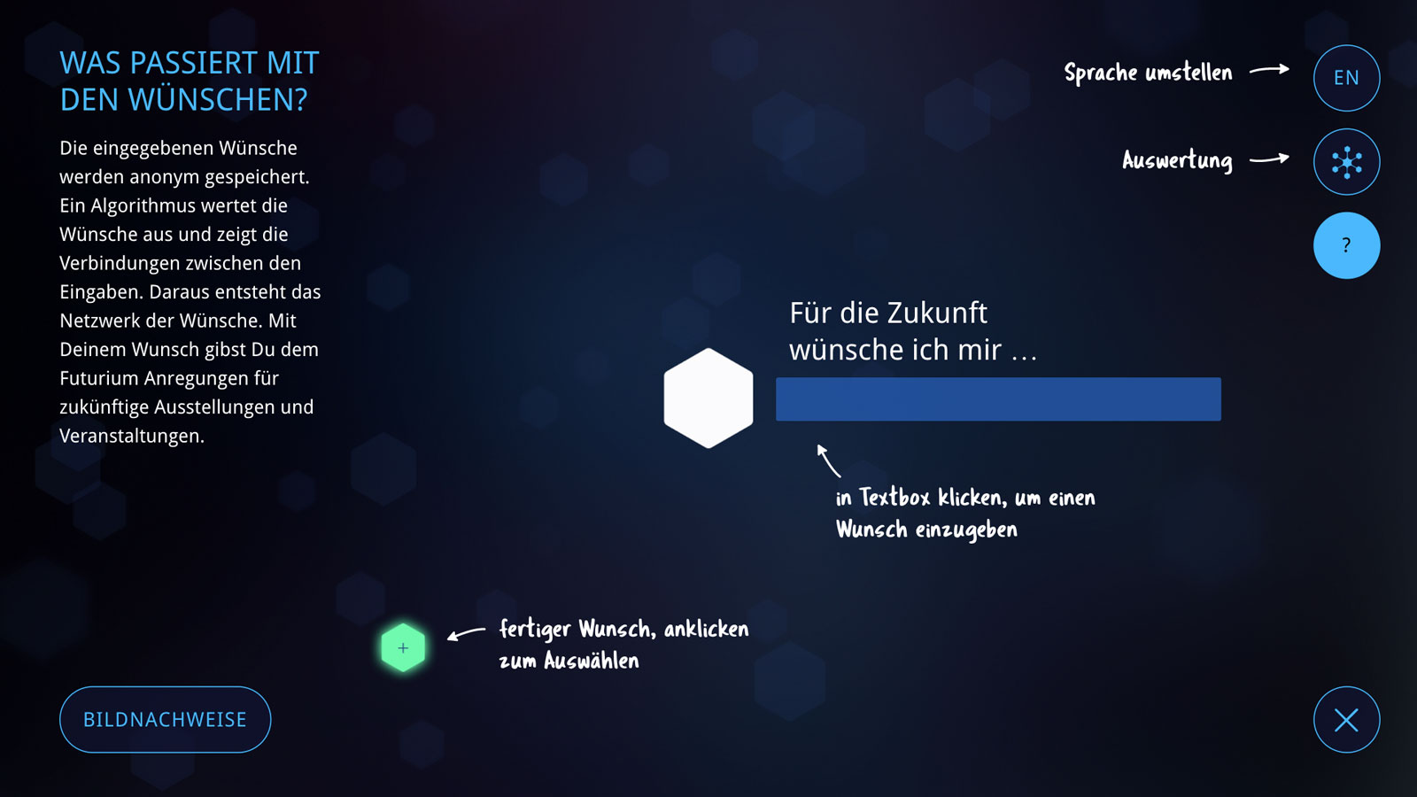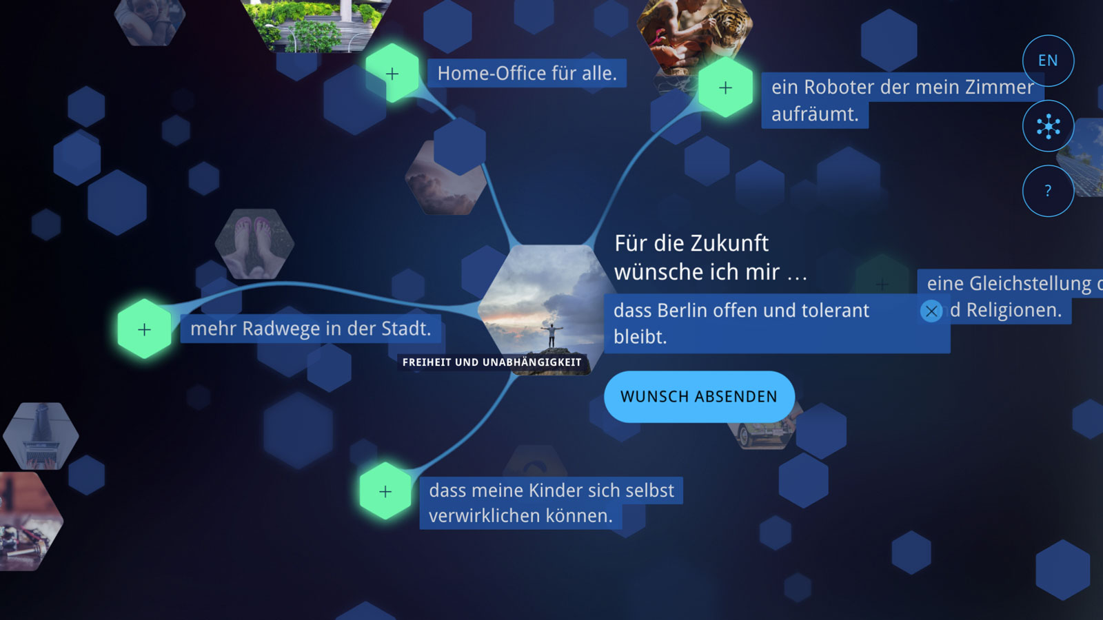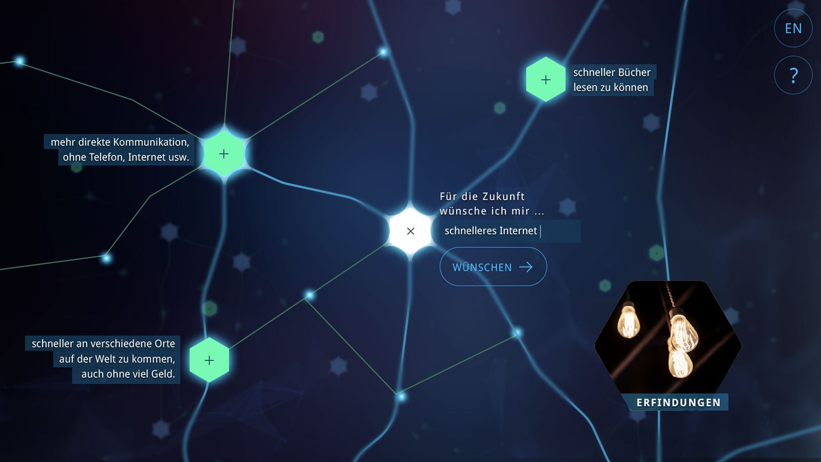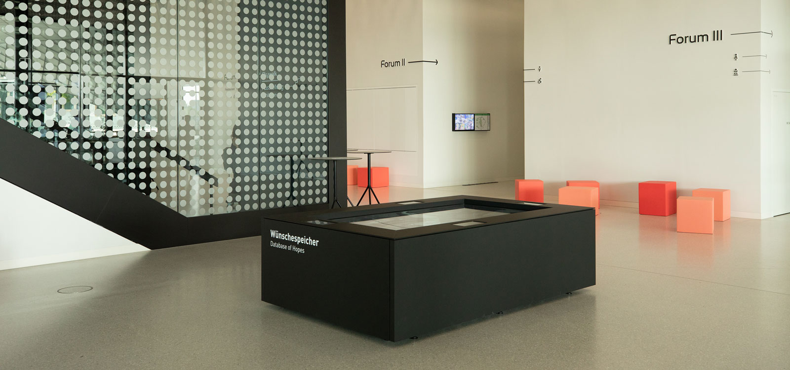 The “Wünschespeicher” is an interactive exhibit and part of the Futurium, a 3,000 m² permanent exhibition about the potential futures. It was designed with the concept idea to collect the wishes of the visitors for the future and visualizing them in a constantly expanding (neural-)network.