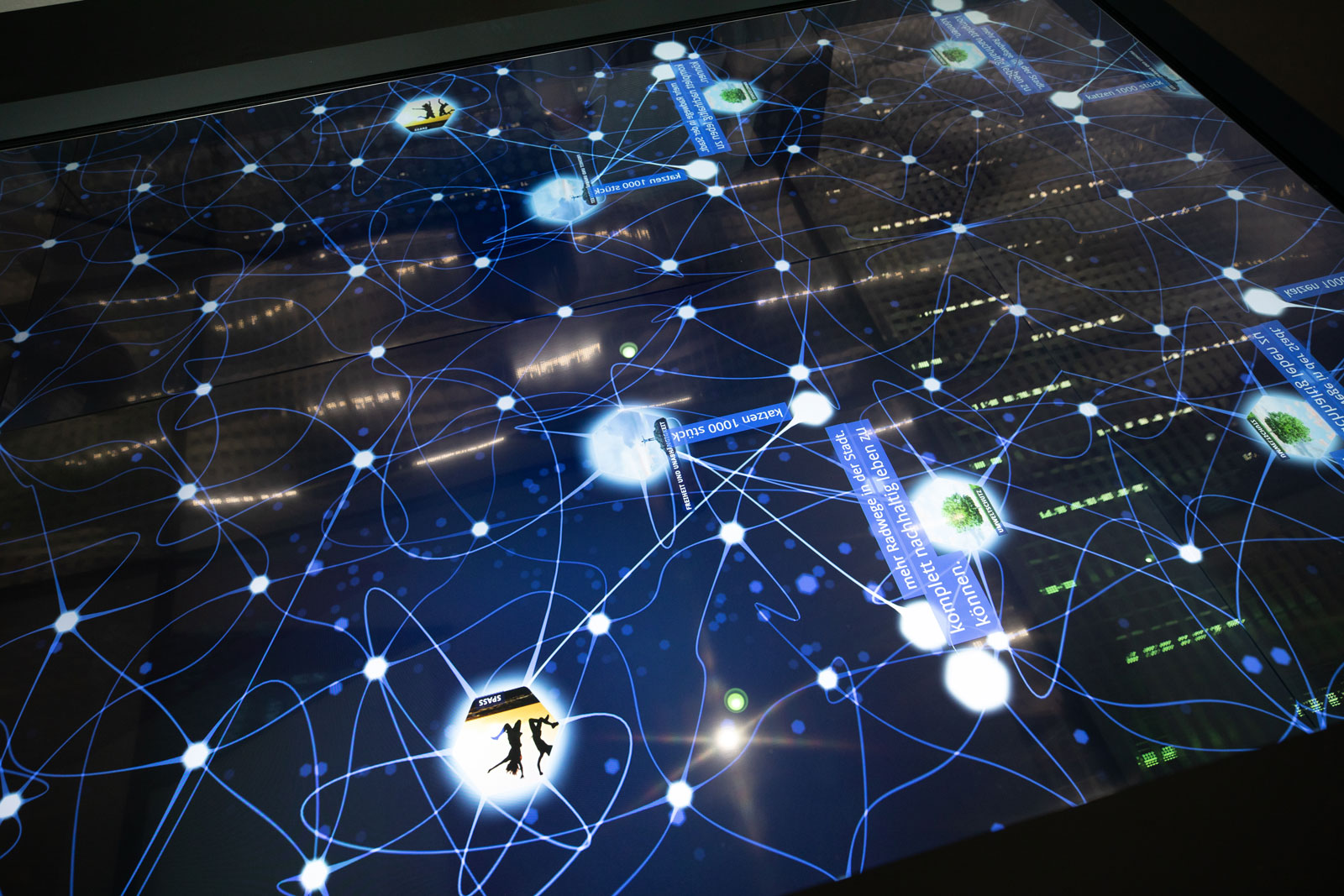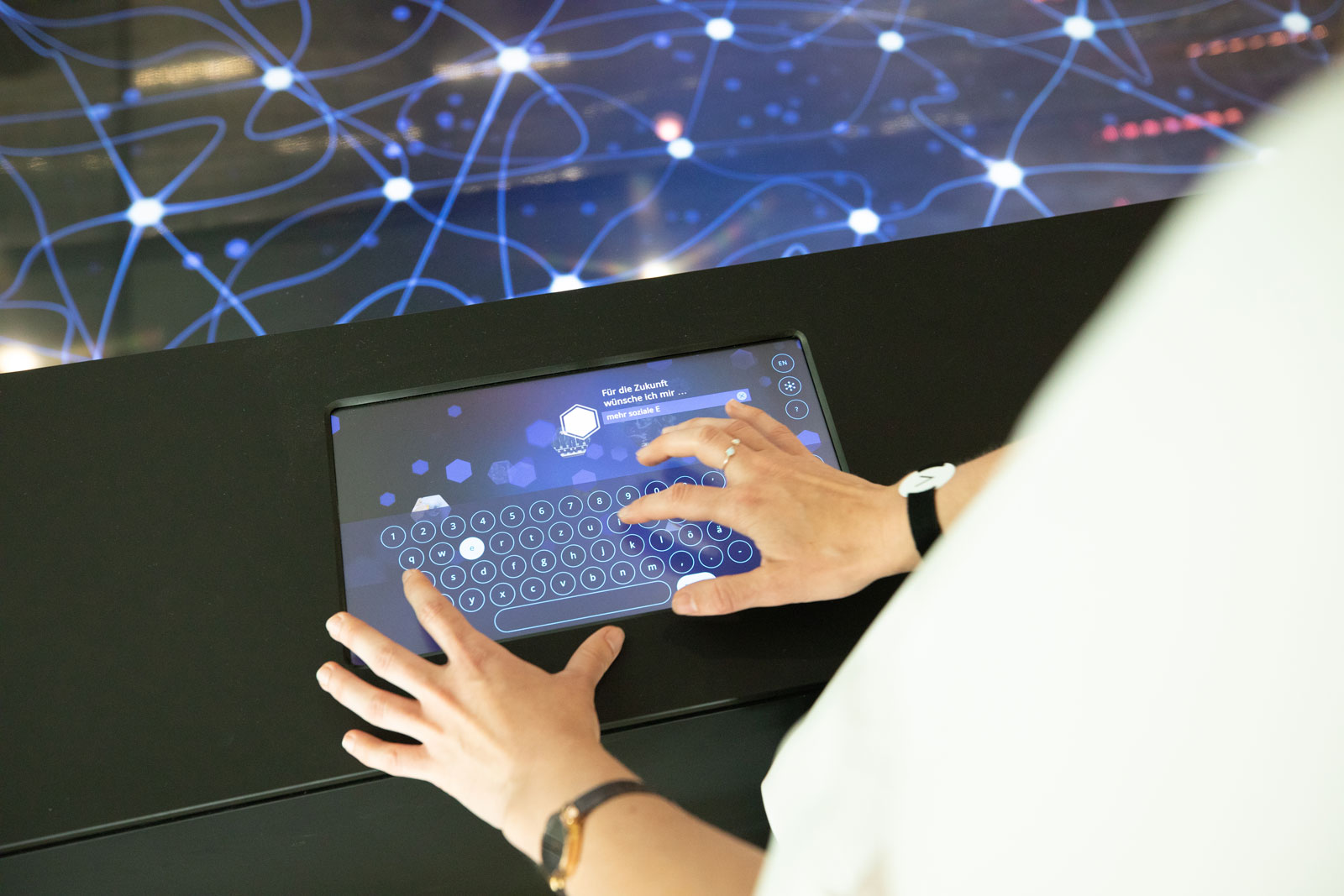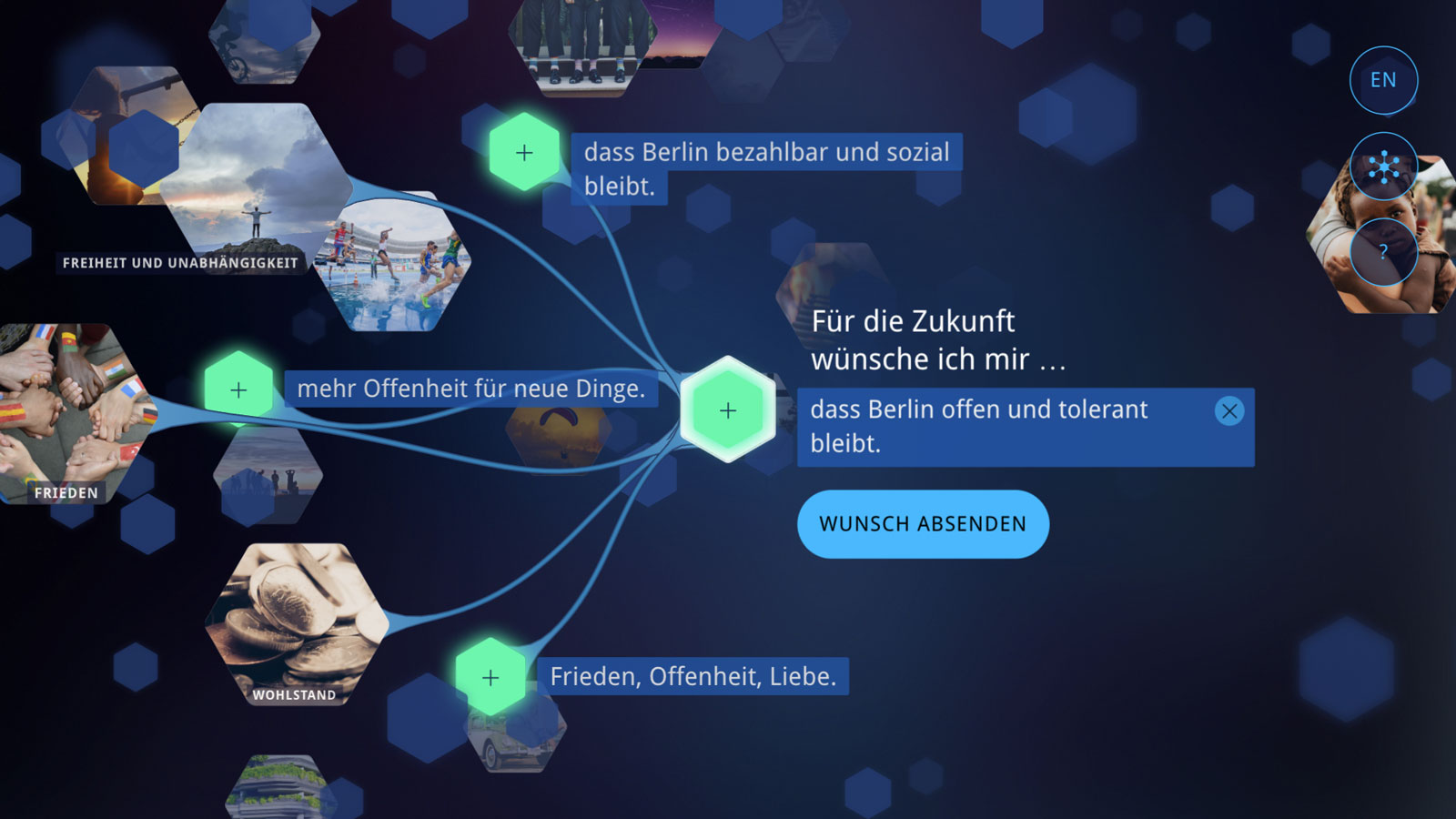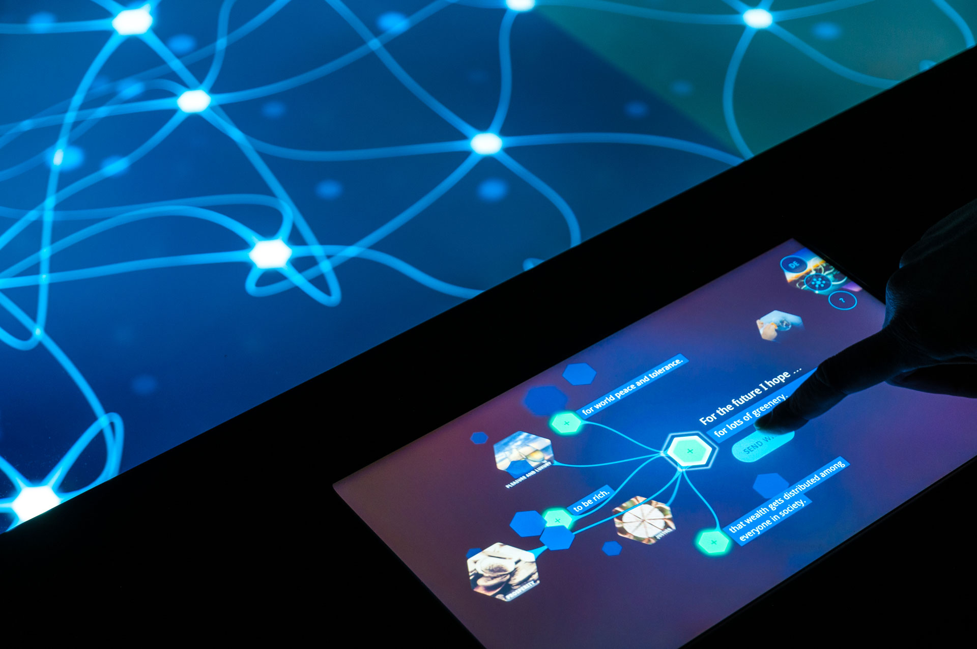 The “Wünschespeicher” is an interactive exhibit and part of the Futurium, a 3,000 m² permanent exhibition about the potential futures. It was designed with the concept idea to collect the wishes of the visitors for the future and visualizing them in a constantly expanding (neural-)network.