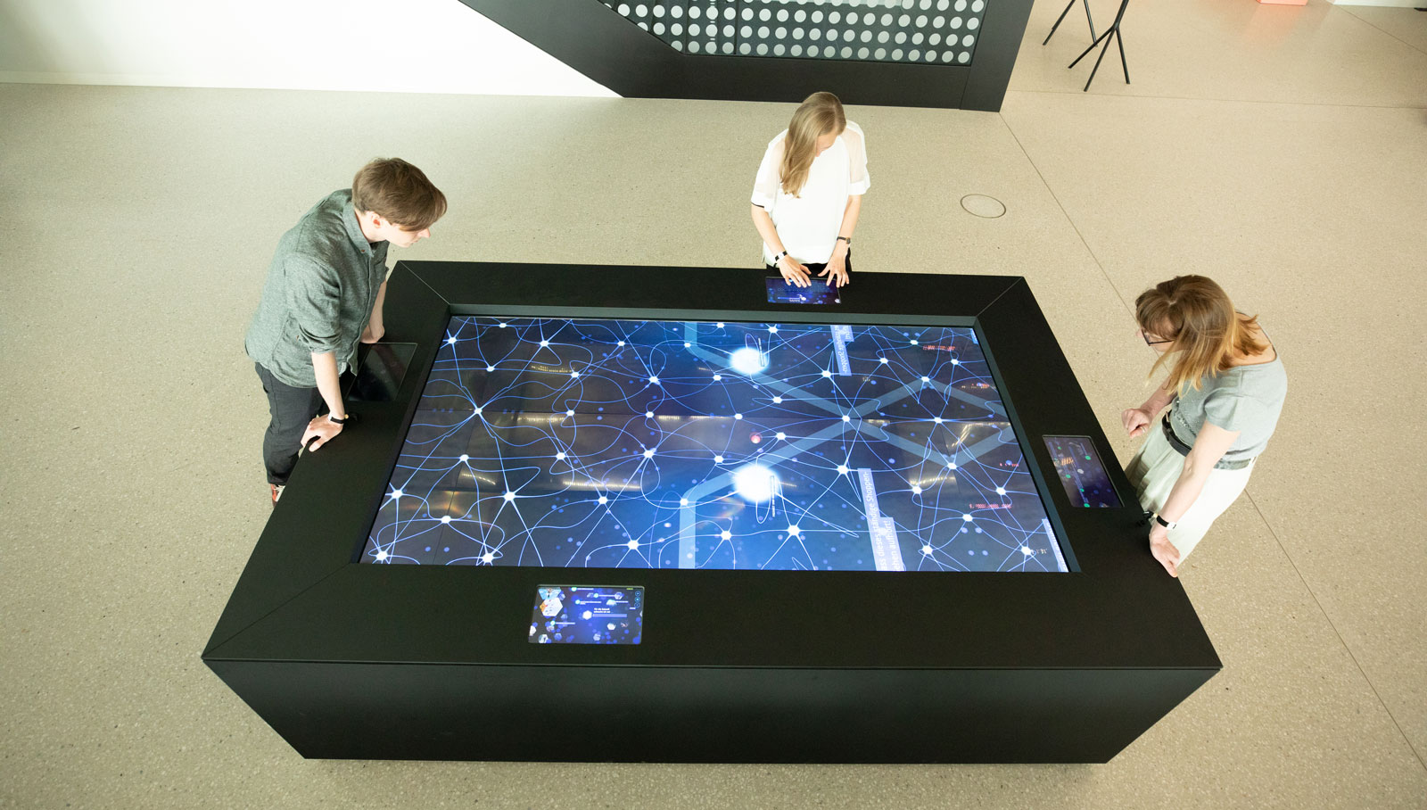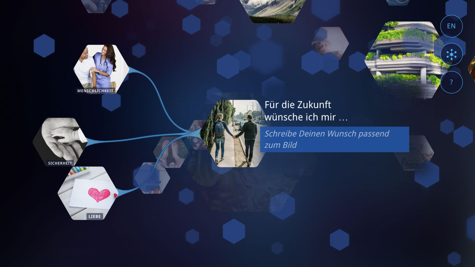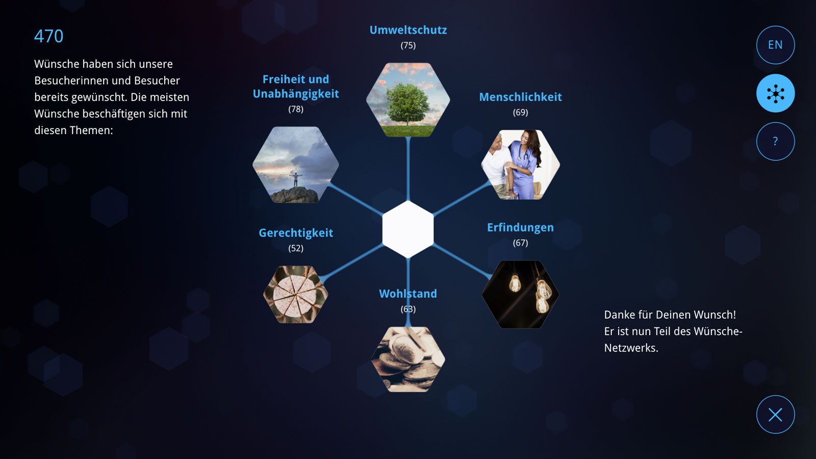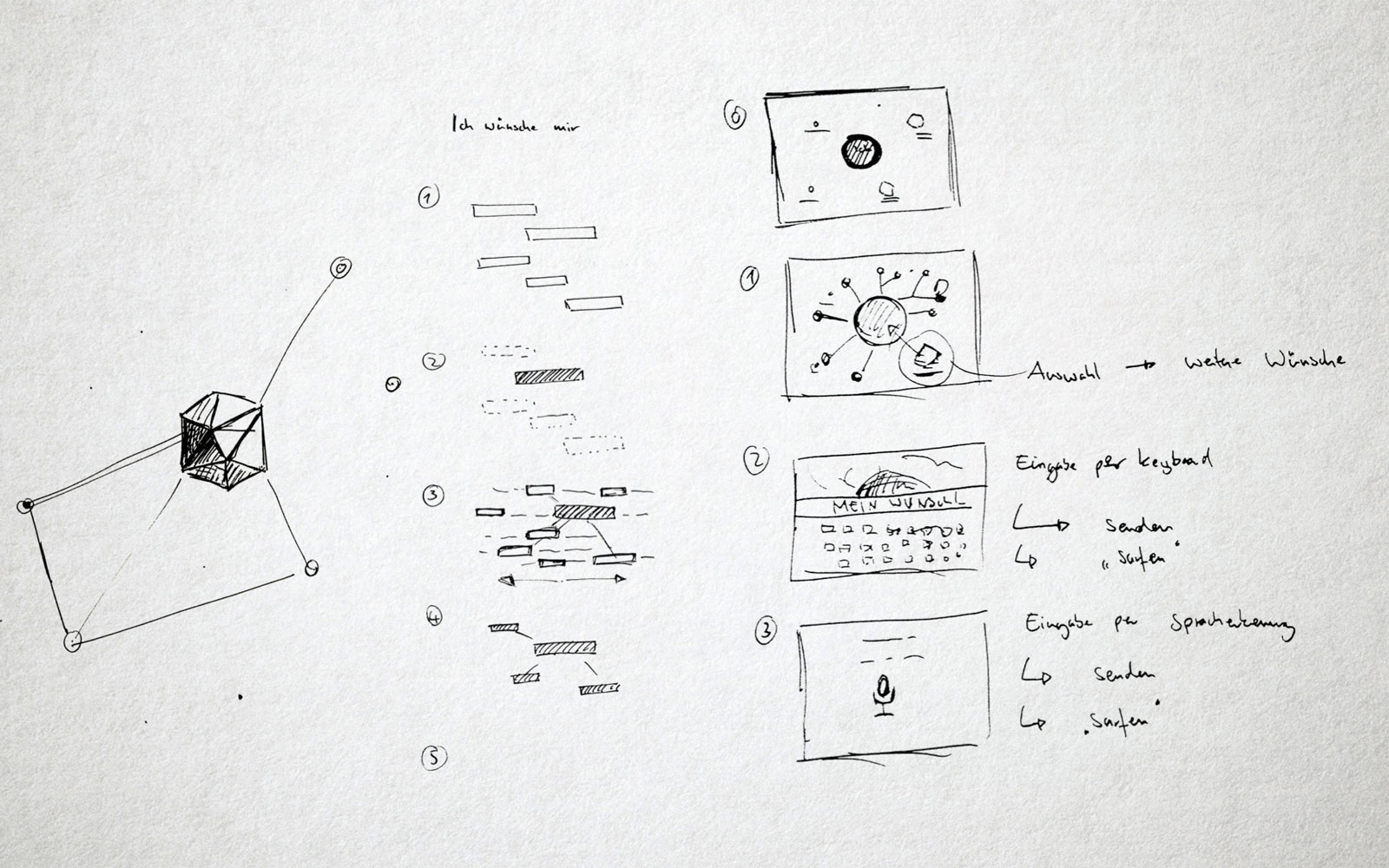 The “Wünschespeicher” is an interactive exhibit and part of the Futurium, a 3,000 m² permanent exhibition about the potential futures. It was designed with the concept idea to collect the wishes of the visitors for the future and visualizing them in a constantly expanding (neural-)network.